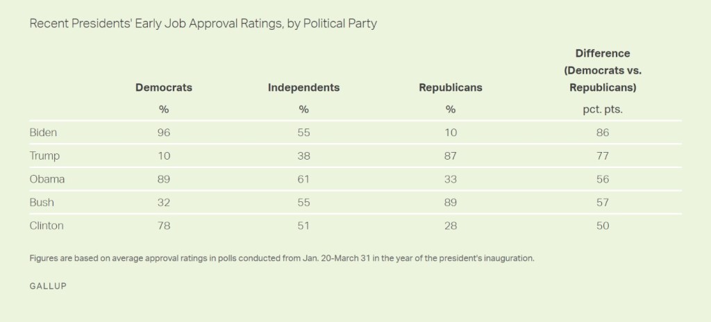 Notably, in addition to matching the greatest party differential in public support, per recent tracking – a clear indication of divisiveness – the president has the same degree of support from Republicans as Donald Trump had of Democrats.