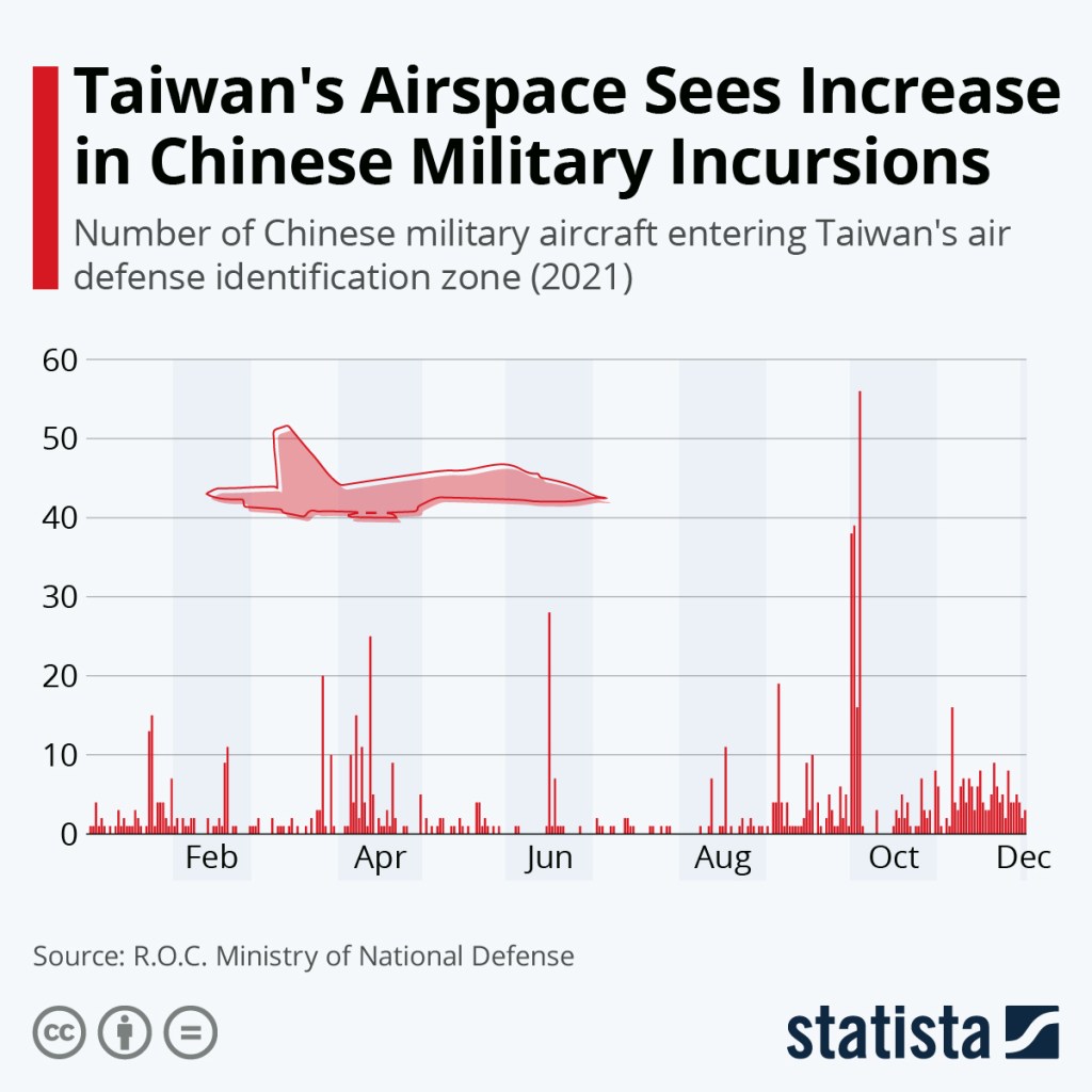 With Russia resting on the edge of invading Ukraine and the West refusing to supply troops, China threatens war with Taiwan, an effort that would aim to complete its long-term goal of ‘reunification.’[75]