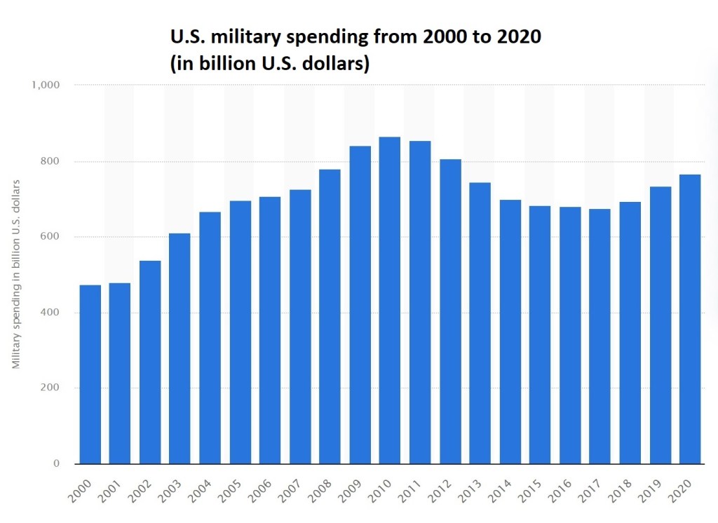 While China has been building up its military both in size and technical capacity, the US, under former president Barrack Obama, cut the military modernization budget,[84] an effort that may have granted China the ability to catch up, if not exceed, US capabilities. Under Biden’s 2021 budget, military spending became one of the few areas that was not adjusted sufficiently to keep pace with the economy, shrinking relative to inflation.[85] The US continues to vastly outspend China on its military, but the latter is seeing relative gains, and it is on pace to exceed US expenditures in about 20 – 25 years.